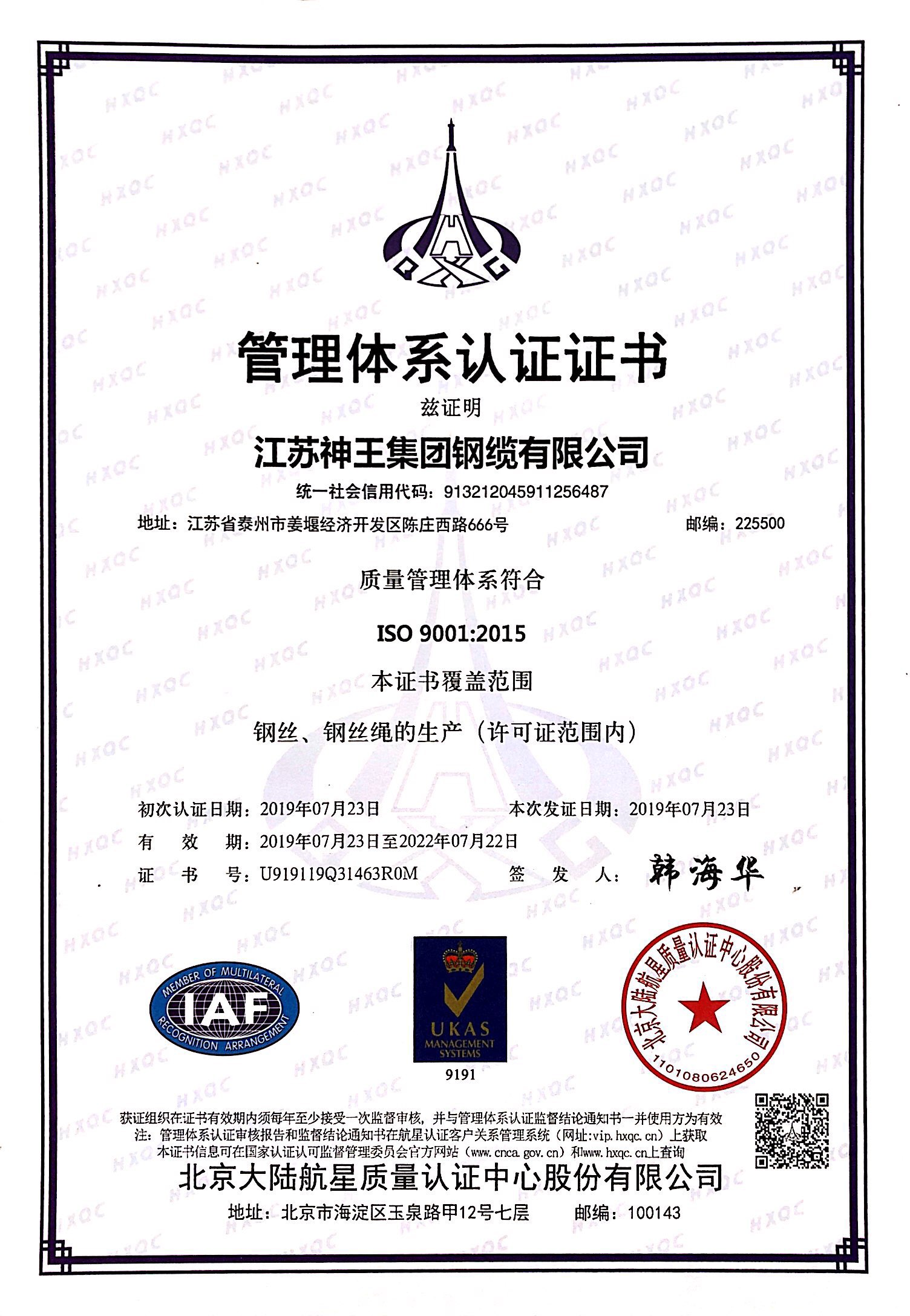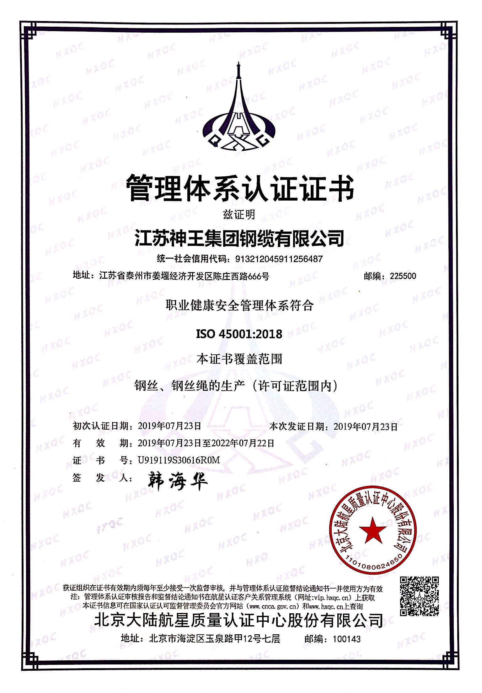 公司始终坚持“质量立本、创新发展、持续改进、服务顾客”的质量方针,充分吸收国内外先进的专业技术和管理方法,坚持以专业的团队,高效的流程,精益的管理,积极探索高科技产业发展的新路子,先后通过了ISO9001、IS014001、OHSAS18001管理体系认证,通过了MA、API等行业认证。公司为全国钢标准化委员会钢丝绳分技术委员会成员单位,先后参与了多项国家标准和行业标准的起草,获得发明和实用新型专利授权证书一百多项;获江苏省高新技术企业、江苏省民营科技企业、公司资信等级AAA级,国家级重合同守信用企业;“神王”商标2014年荣获“中国驰名商标”。